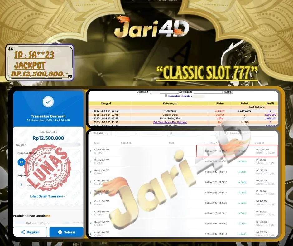 Bukti JP CLASSIC SLOT 777 Hari ini Di Situs JARI4D Sebesar Rp.12,500,000,- Tuntas !!