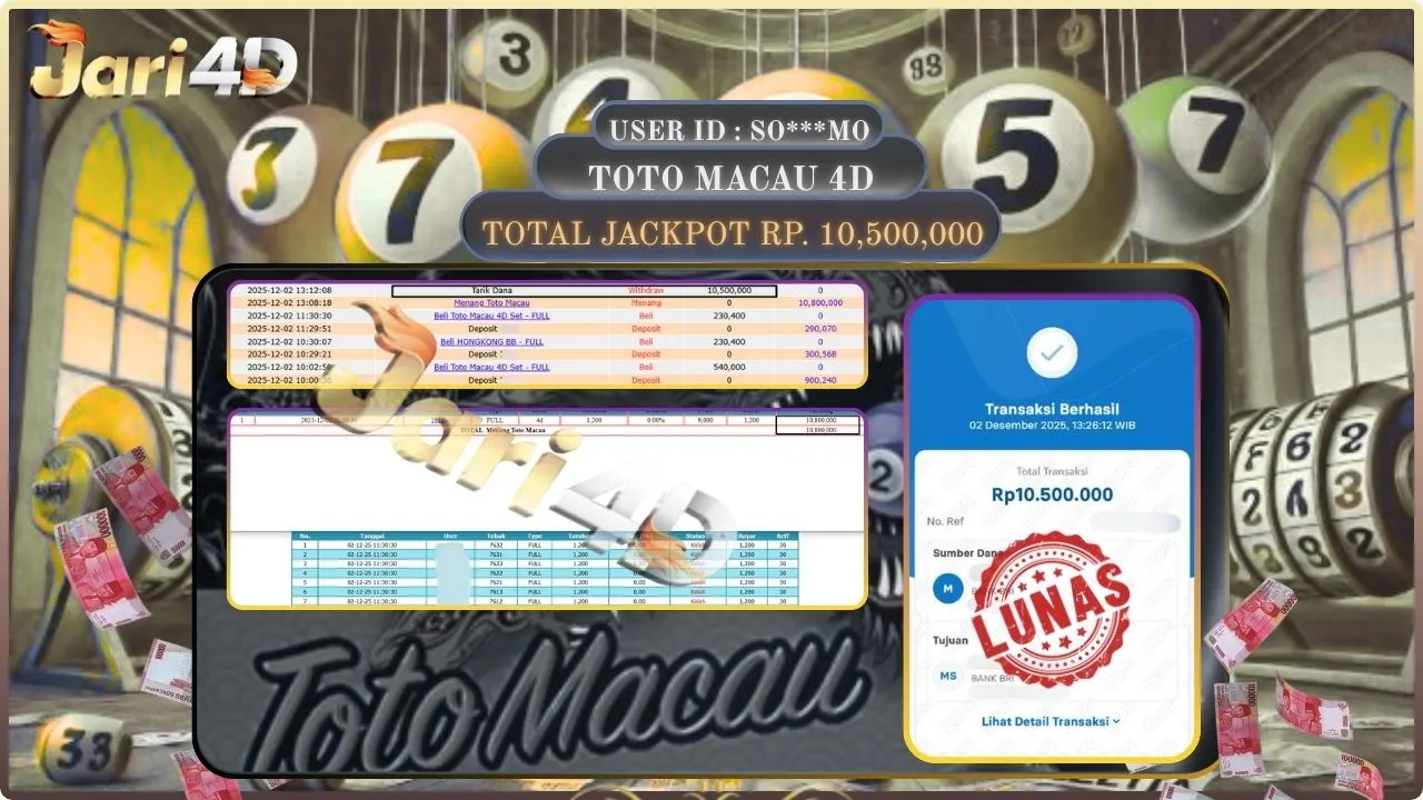 Bukti JP TOTO MACAU 4D Hari ini Di Situs JARI4D Sebesar Rp.10,500,000,- Tuntas !!