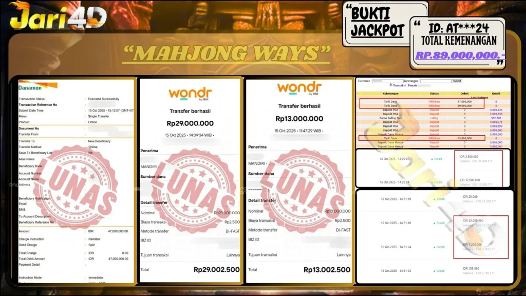 Bukti JP MAHJONG WAYS Hari ini Di Situs JARI4D Sebesar Rp.45,000,000,- Tuntas !! Read More »