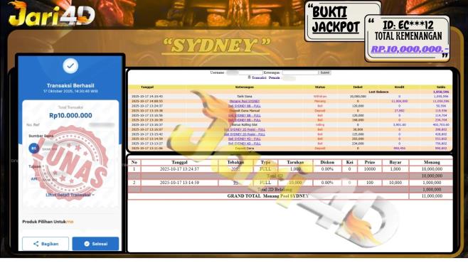 Bukti JP SYDNEY Hari ini Di Situs JARI4D Sebesar Rp.10,000,000,- Tuntas !!