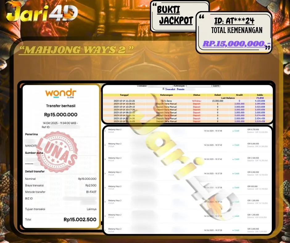 Bukti JP MAHJONG WAYS 2 Hari ini Di Situs JARI4D Sebesar Rp.15,000,000,- Tuntas !!