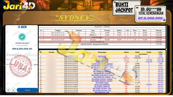 Bukti JP SYDNEY Hari ini Di Situs JARI4D Sebesar Rp.8,000,000,- Tuntas !!