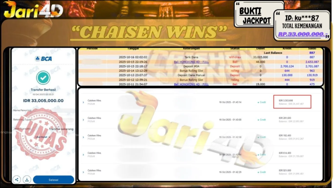 Bukti JP CHAISEN WINS Hari ini Di Situs JARI4D Sebesar Rp.33,000,000,- Tuntas !!