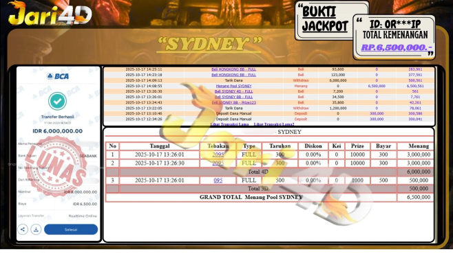 Bukti JP SYDNEY Hari ini Di Situs JARI4D Sebesar Rp.6,500,000,- Tuntas !!