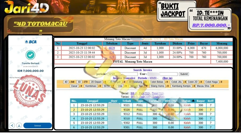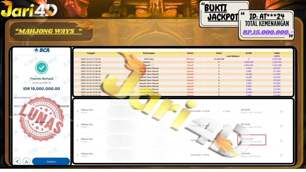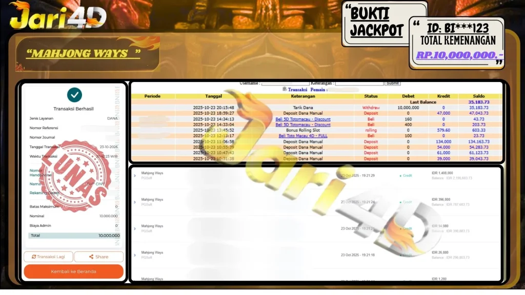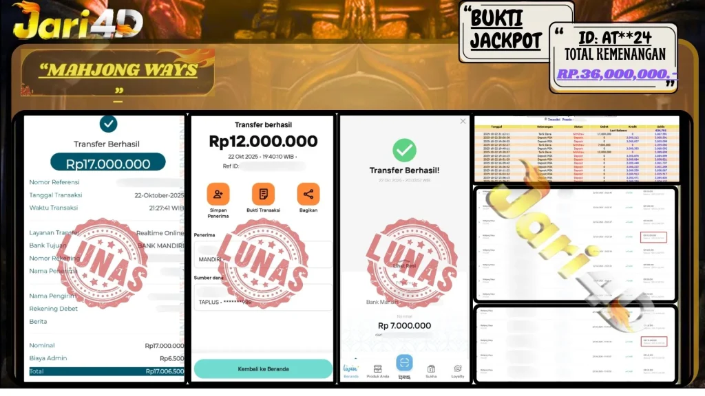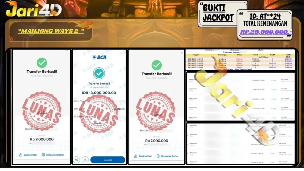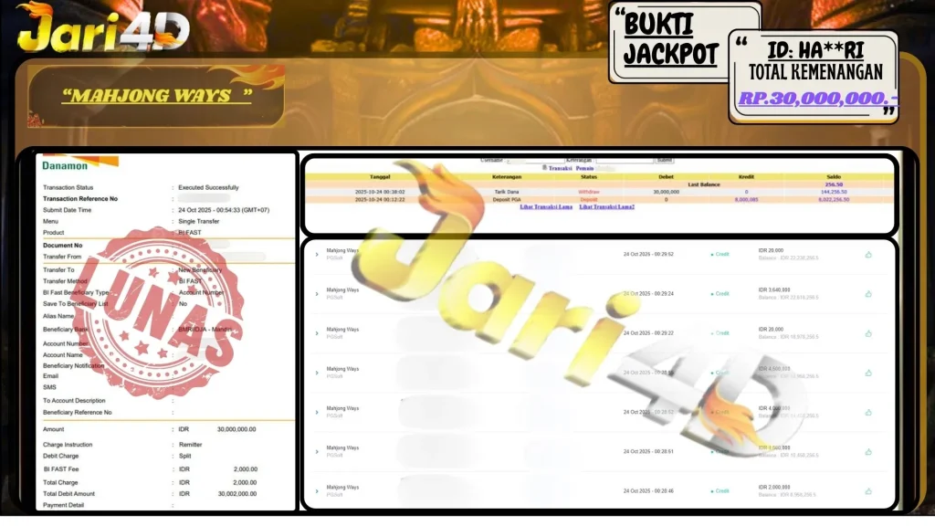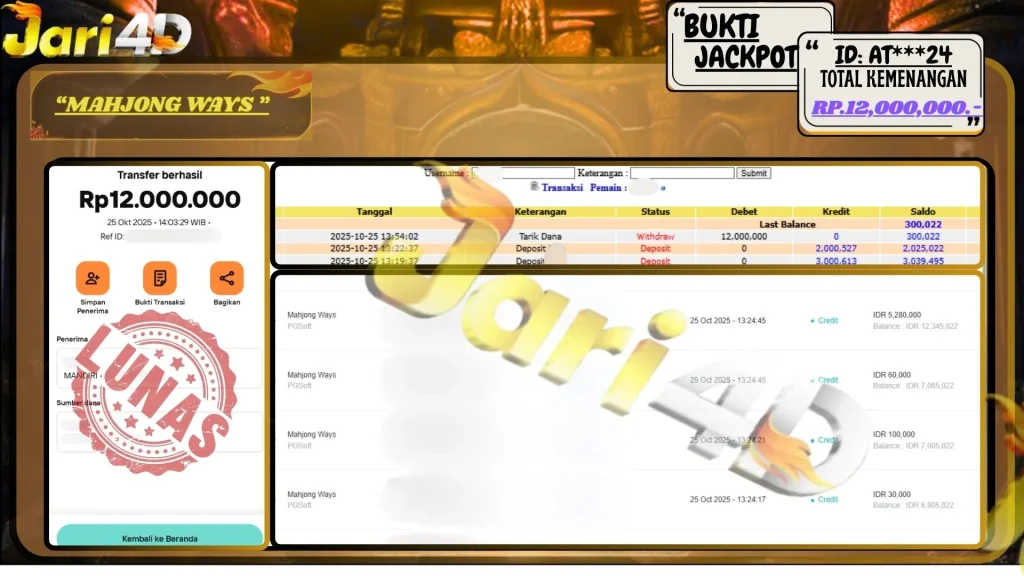 Bukti JP MAHJONG WAYS Hari ini Di Situs JARI4D Sebesar Rp.12,000,000,- Tuntas !! Read More »